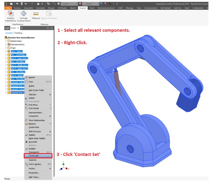 « Contact Set » مجموعهای از تمام اجزایی است که هنگام فعال شدن حلکننده تماس در نظر گرفته میشوند؛ یعنی این اجزا اجازه تقاطع نخواهند داشت. برای اضافه کردن اجزا به مجموعه تماس، کافیست موارد زیر را انجام دهید: