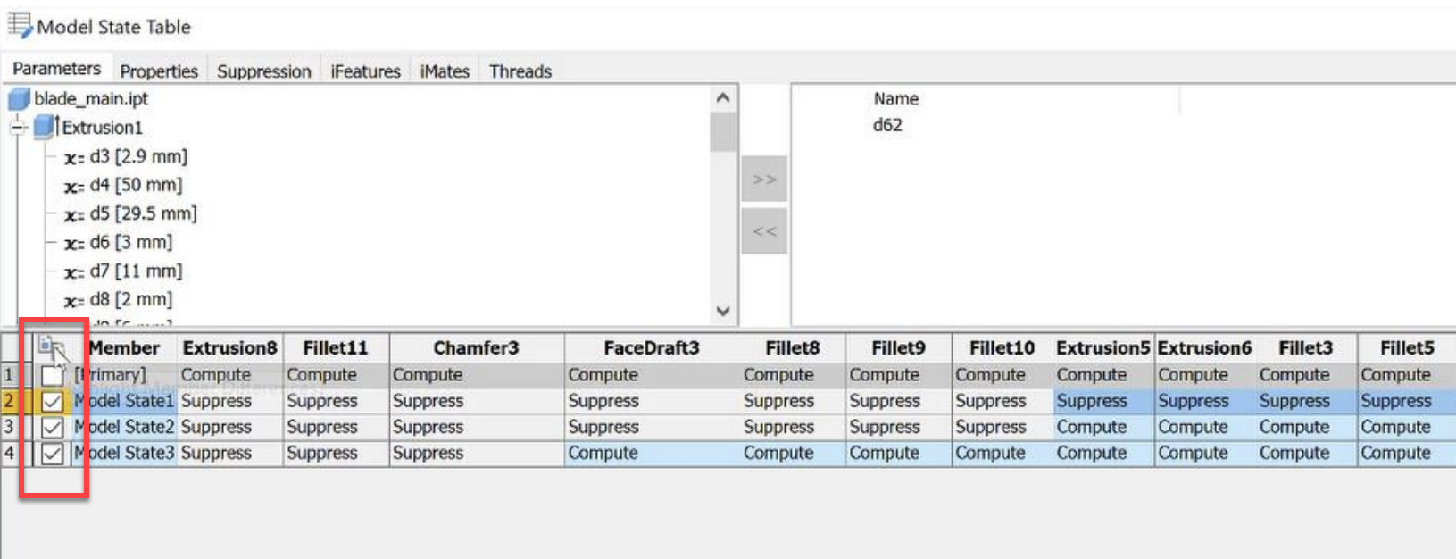 هنگام ویرایش جدول iComponent یا   Model State ، یک ستون مقایسه( Compare  )جدید با یک کادر انتخاب برای انتخاب ردیف‌ها اضافه می‌شود. به طور پیش‌فرض، همه ردیف‌ها علامت زده نشده‌اند. برای اضافه کردن یا حذف ردیف‌ها از مقایسه،  میتواتن تیک زد یا تیک آنرا حذف کرد.