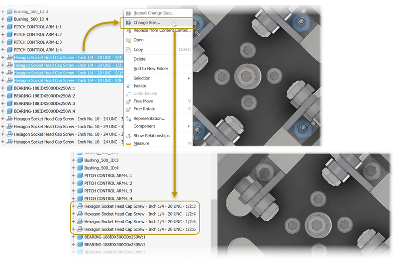 اکنون می‌توانید چندین قطعه را از مرکز محتوا و از یک خانواده انتخاب کنید و اندازه همه قطعات انتخاب شده را به یک اندازه تغییر دهید.  گزینه تغییر اندازه(Change Size)  زمانی فعال می‌شود که همه قطعات کتابخانه قطعات استاندارد انتخاب شده از یک خانواده باشند، صرف نظر از اندازه آنها. کادر محاوره‌ای Component با پارامترهای اولین قطعه انتخاب شده پر خواهد شد.